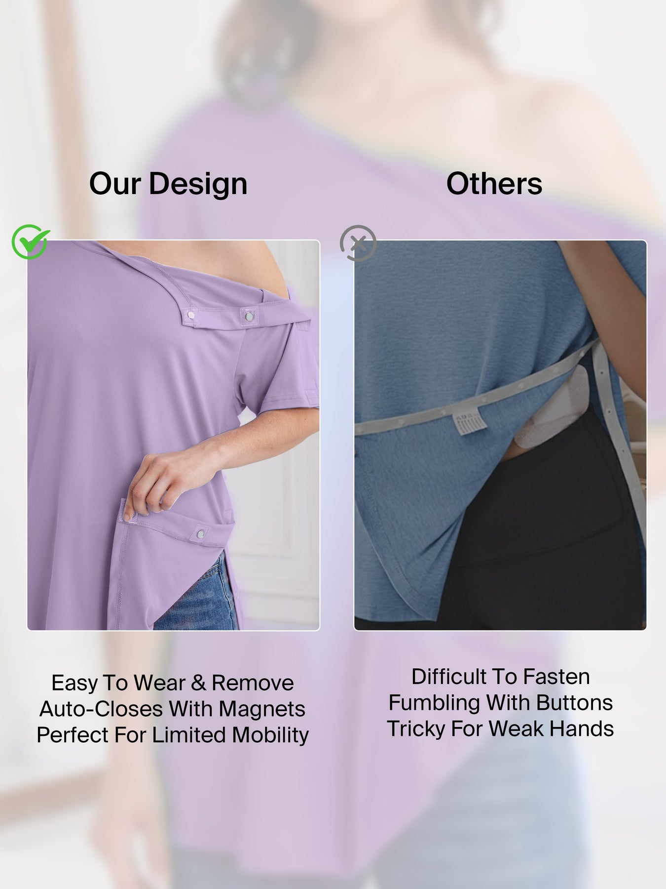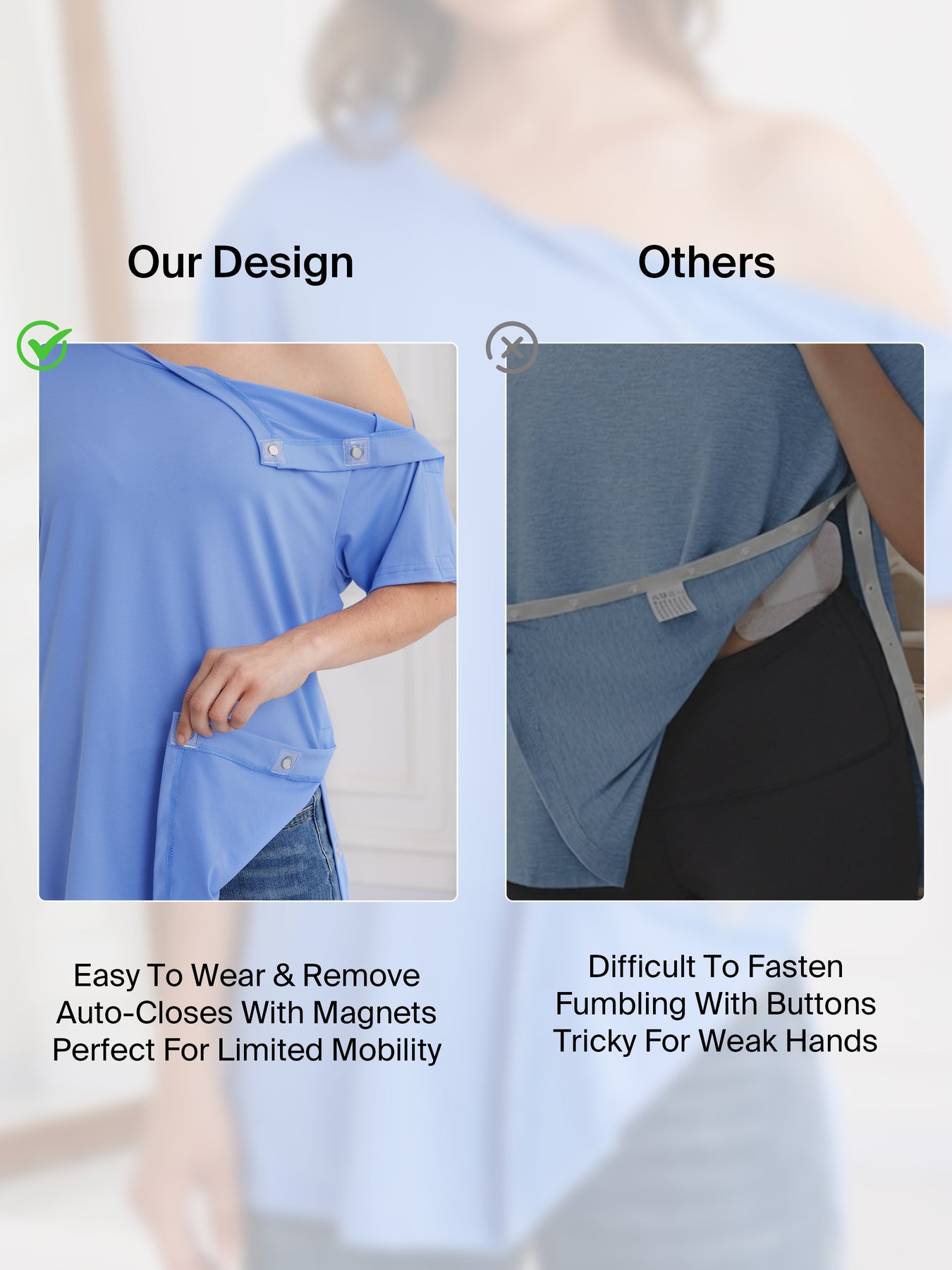 Designed to support comfortable, stress-free recovery, this adaptive magnetic-closure top allows easy one-handed dressing without snaps or Velcro. Soft, breathable fabric and a relaxed fit provide all-day comfort, making it ideal for post-surgery recovery, limited mobility, and everyday wear during healing.