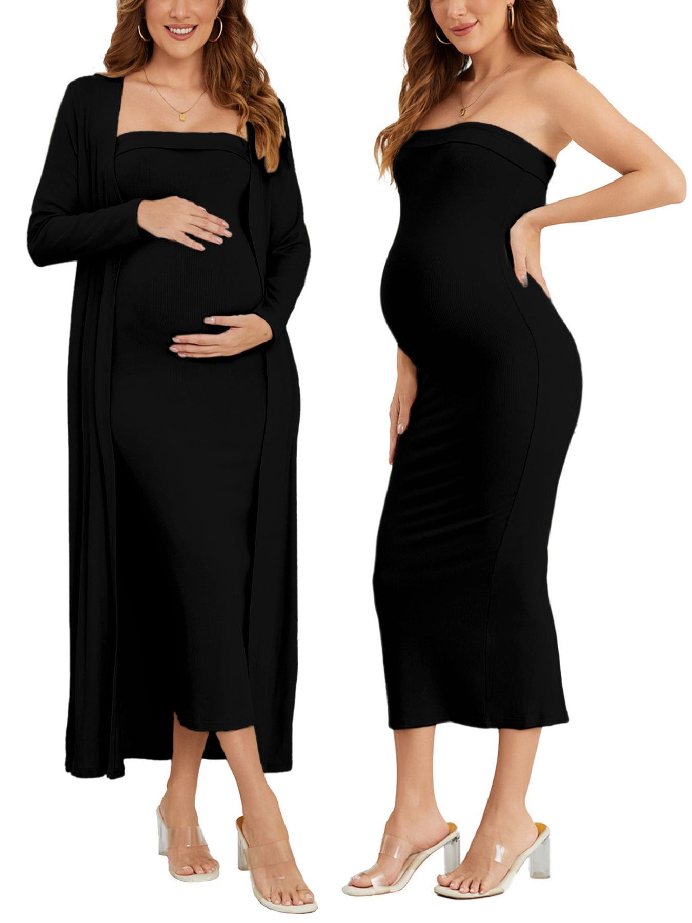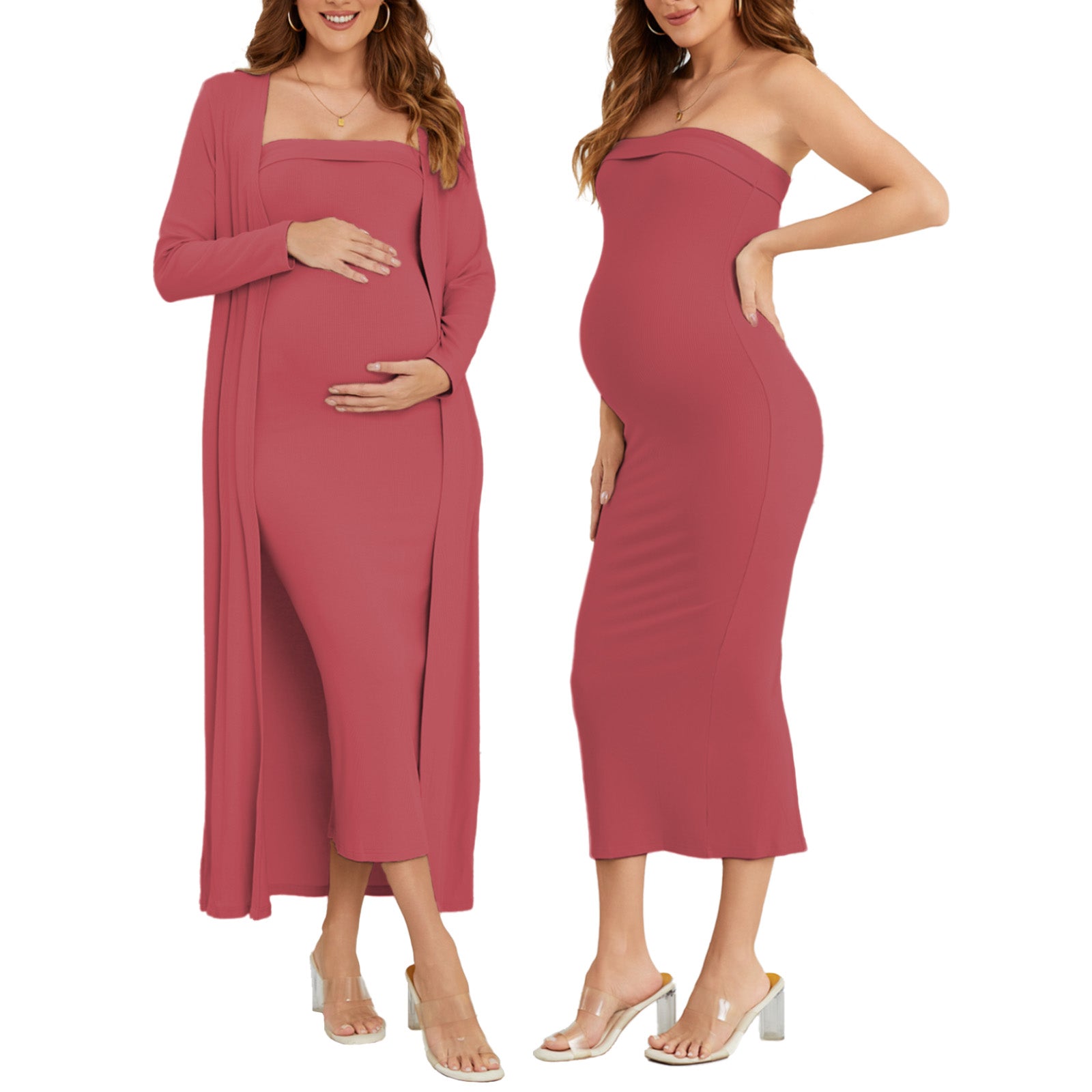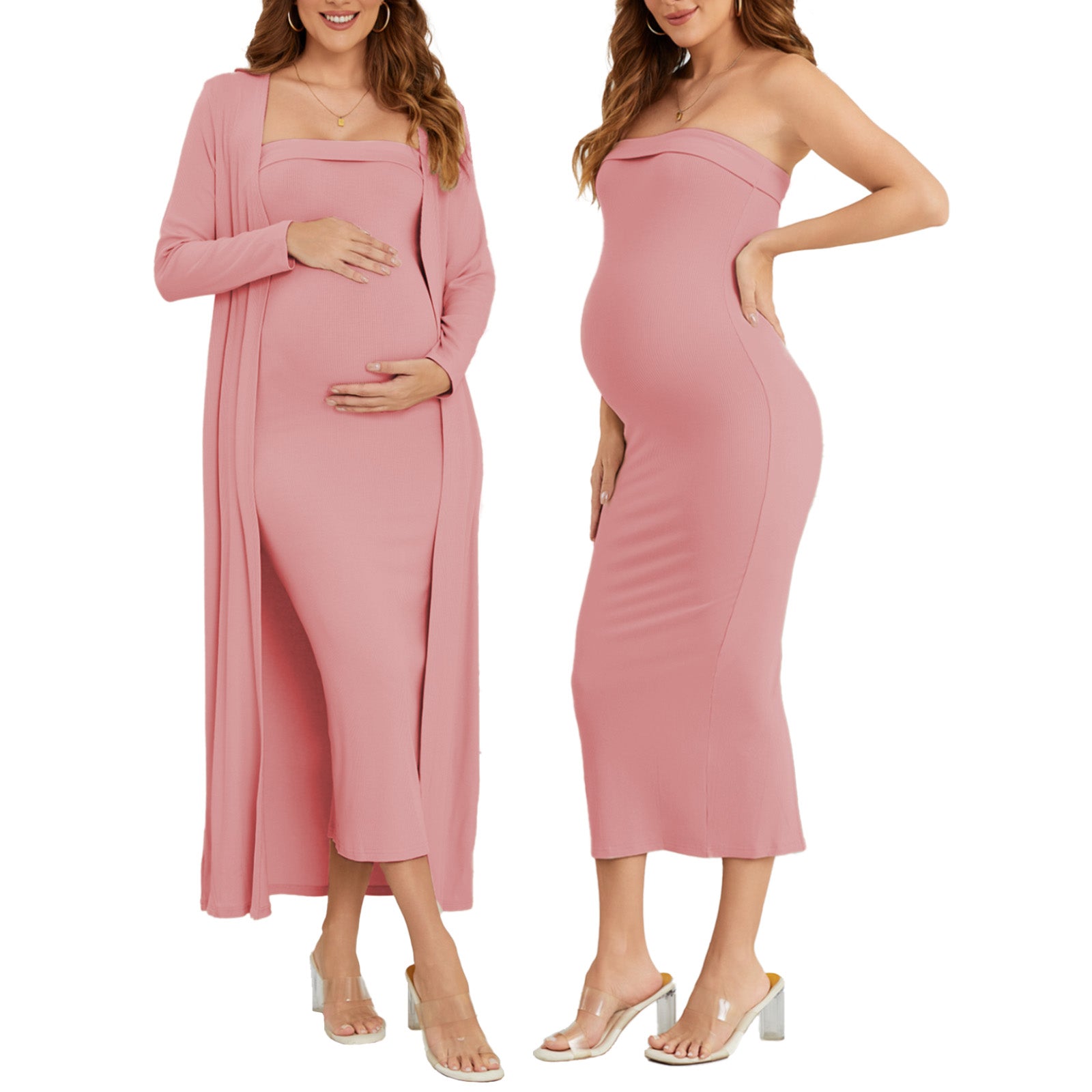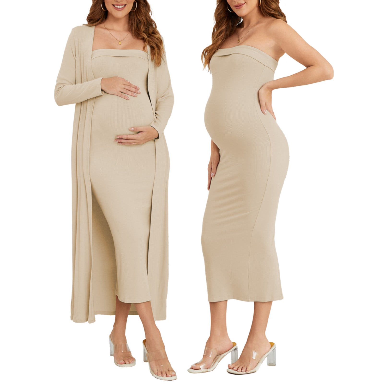 This ribbed maternity 2-piece set features a strapless tube dress and a long-sleeve cardigan for an effortlessly flattering, comfortable fit throughout pregnancy. Soft, breathable stretch fabric adapts to your changing shape, while the elegant silhouette transitions seamlessly from everyday wear to special occasions like baby showers and photoshoots.