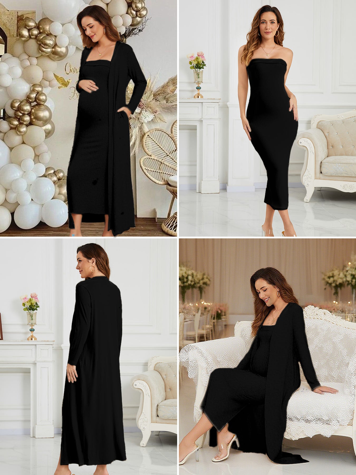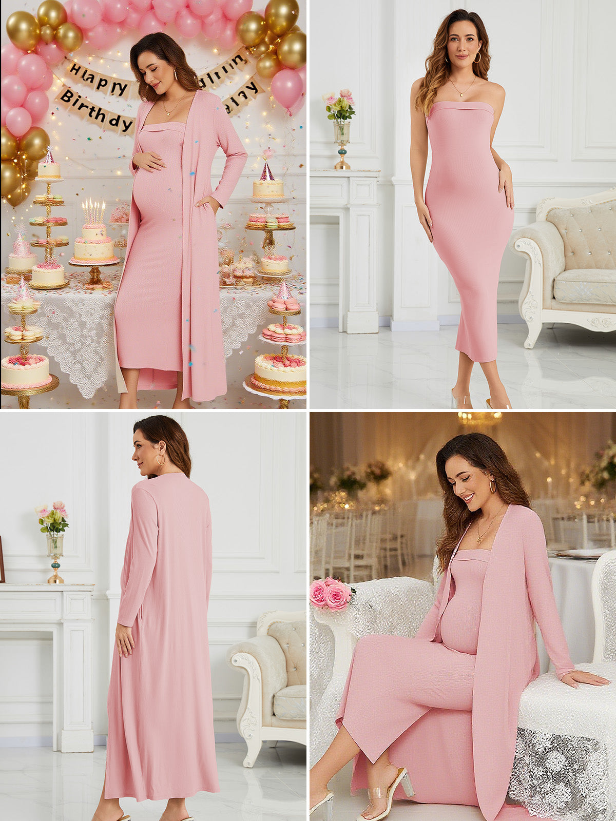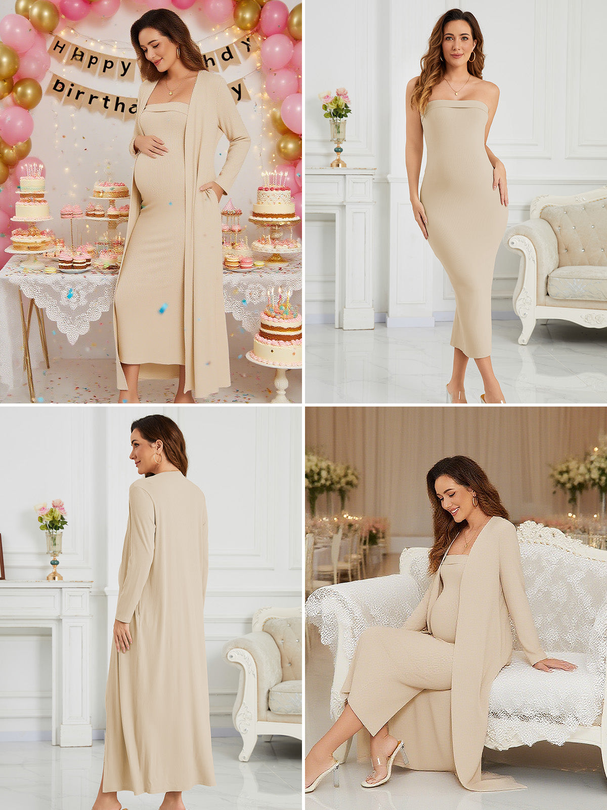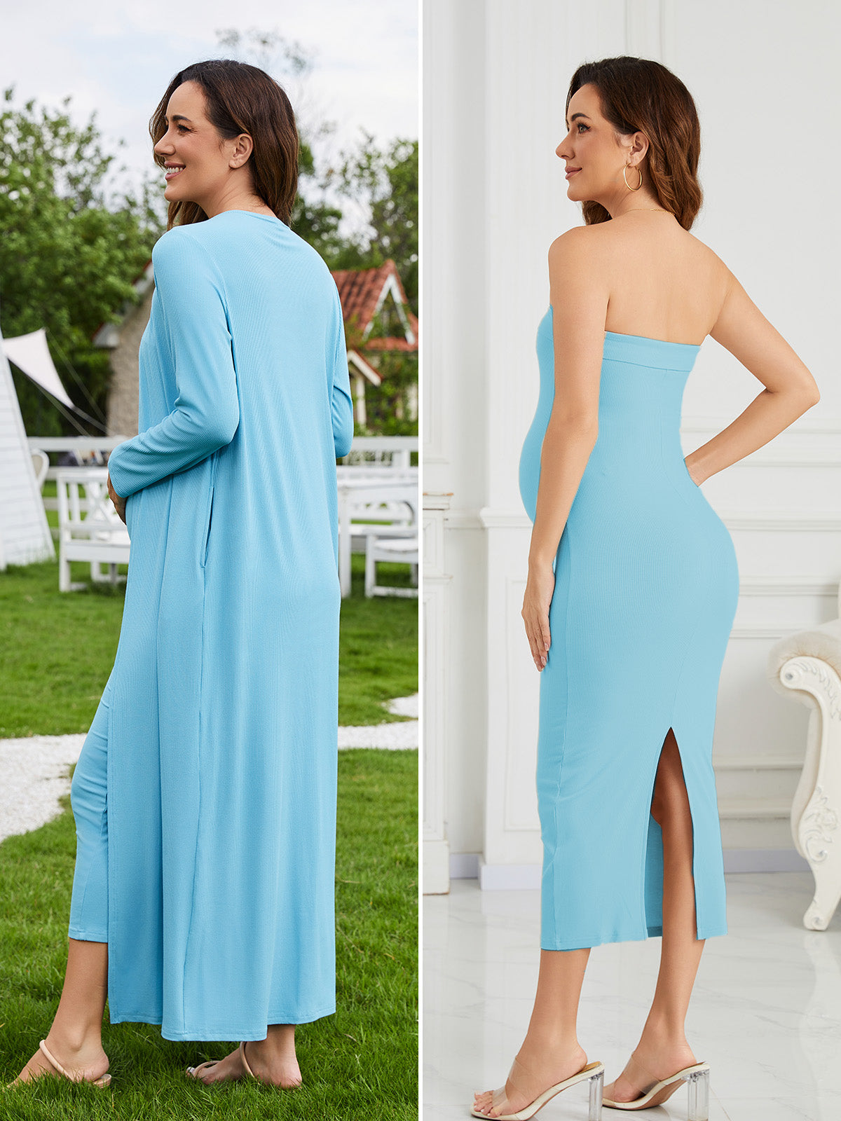 This ribbed maternity 2-piece set features a strapless tube dress and a long-sleeve cardigan for an effortlessly flattering, comfortable fit throughout pregnancy. Soft, breathable stretch fabric adapts to your changing shape, while the elegant silhouette transitions seamlessly from everyday wear to special occasions like baby showers and photoshoots.