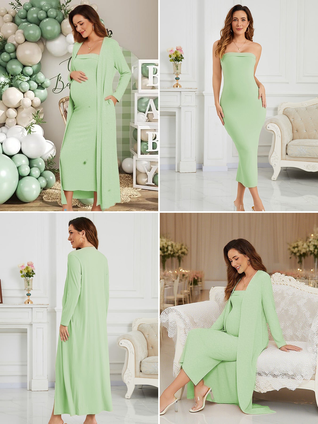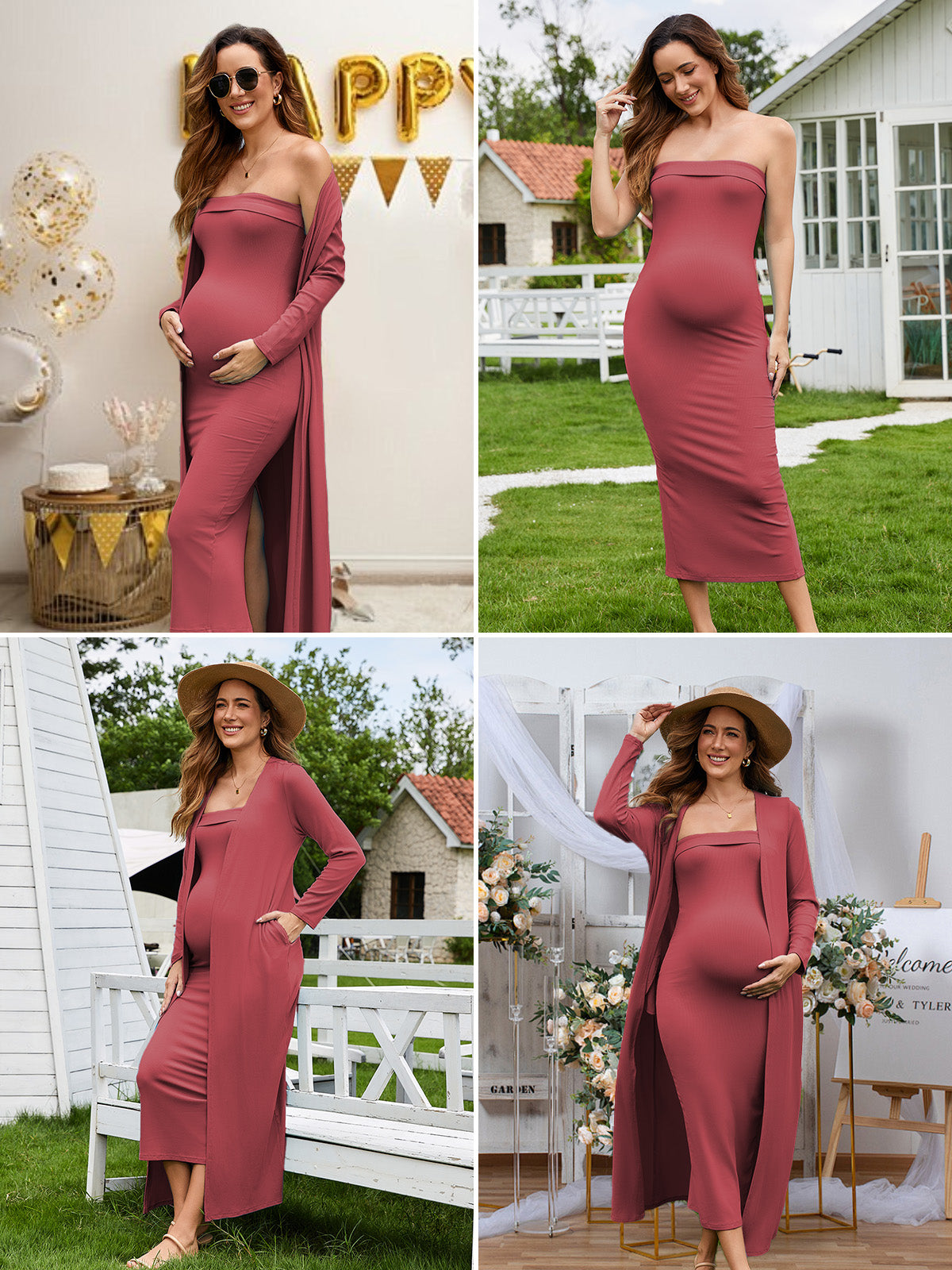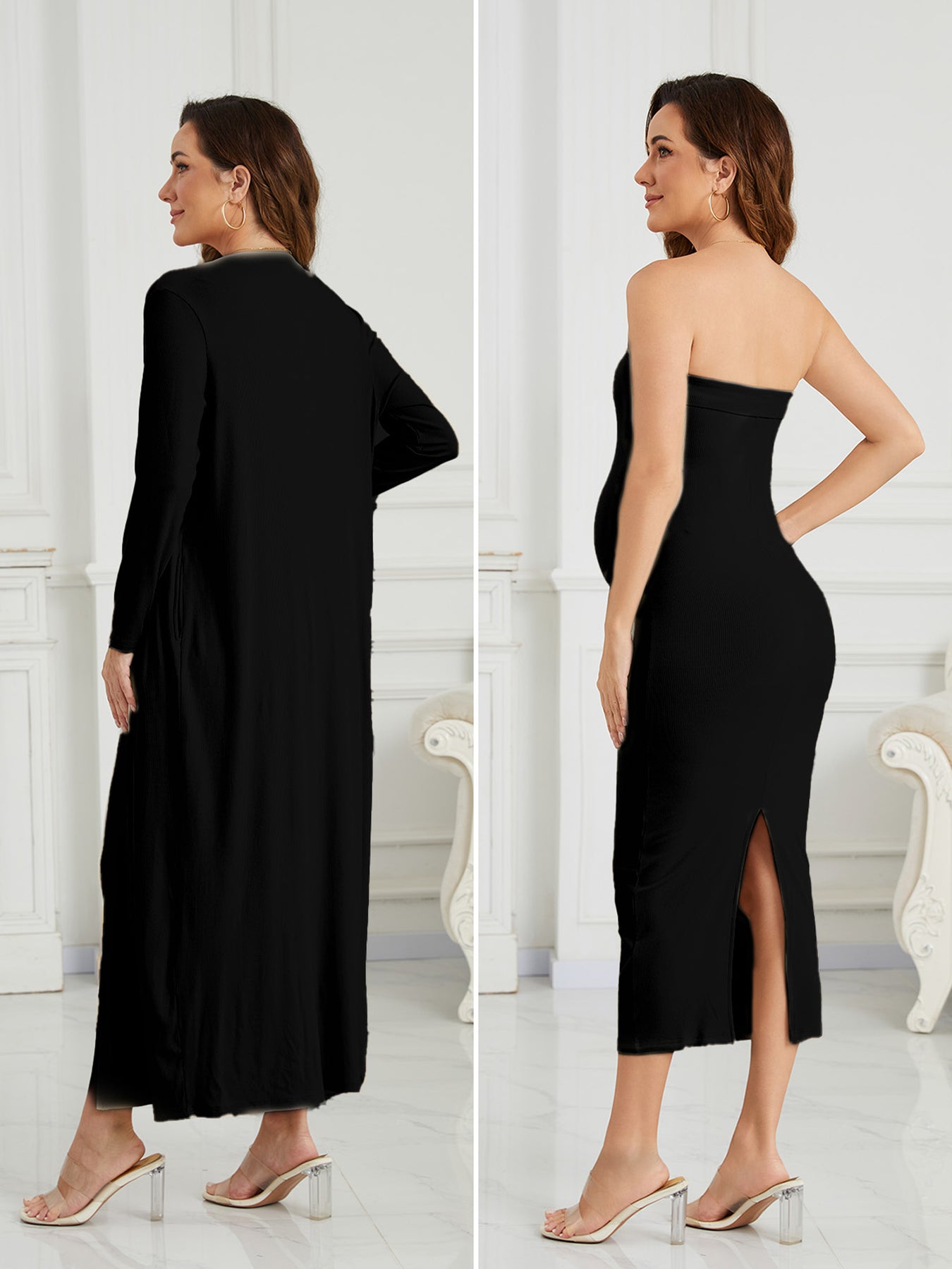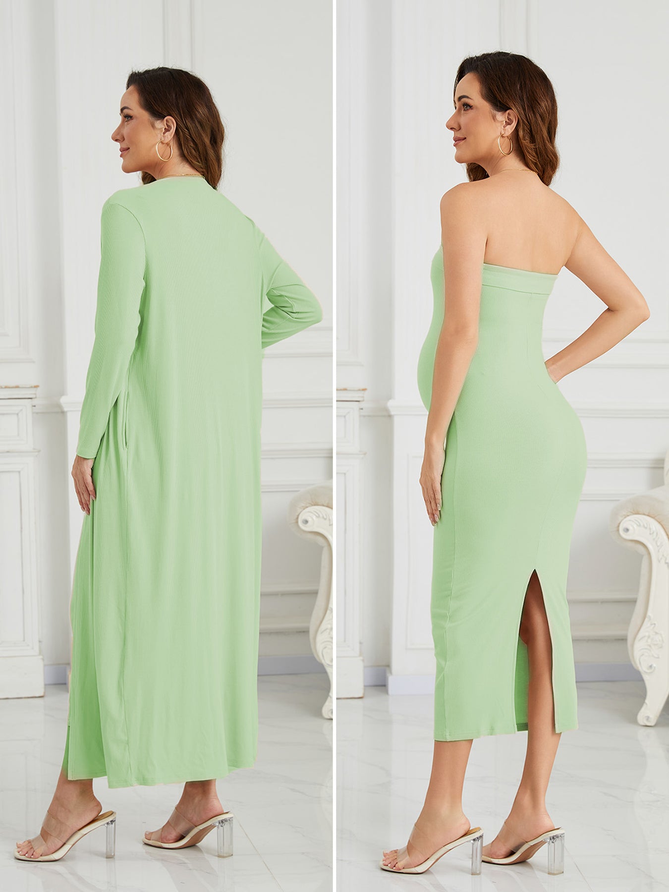 This ribbed maternity 2-piece set features a strapless tube dress and a long-sleeve cardigan for an effortlessly flattering, comfortable fit throughout pregnancy. Soft, breathable stretch fabric adapts to your changing shape, while the elegant silhouette transitions seamlessly from everyday wear to special occasions like baby showers and photoshoots.